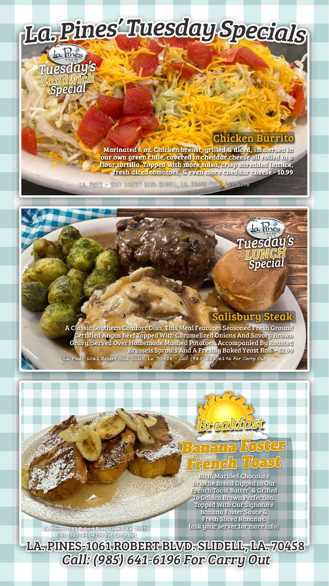 La. Pines – 1061 Robert Blvd, Slidell, LA 70458 – Call (985) 641-6196 for delivery or carryout.